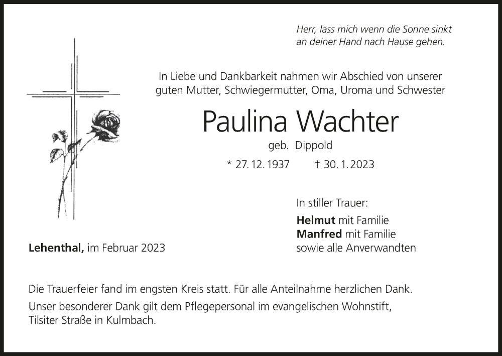 Hier finden Sie alle Traueranzeigen aus der Zeitung, die bisher für Paulina Wachter erschienen sind. Weitere Traueranzeigen, die in der Zeitung erscheinen, werden hier ebenfalls aufgelistet