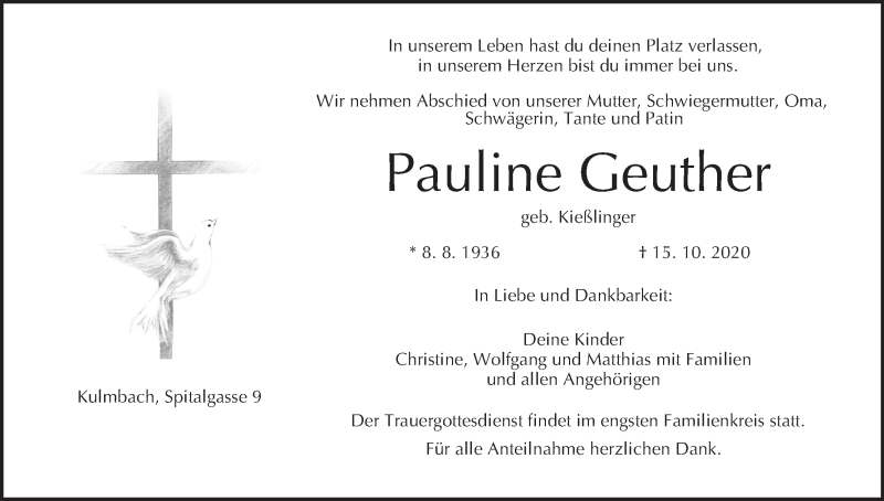 Hier finden Sie alle Traueranzeigen aus der Zeitung, die bisher für Pauline Geuther erschienen sind. Weitere Traueranzeigen, die in der Zeitung erscheinen, werden hier ebenfalls aufgelistet