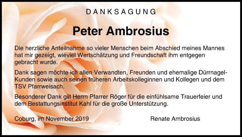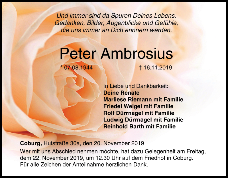 Hier finden Sie alle Traueranzeigen aus der Zeitung, die bisher für Peter Ambrosius erschienen sind. Weitere Traueranzeigen, die in der Zeitung erscheinen, werden hier ebenfalls aufgelistet