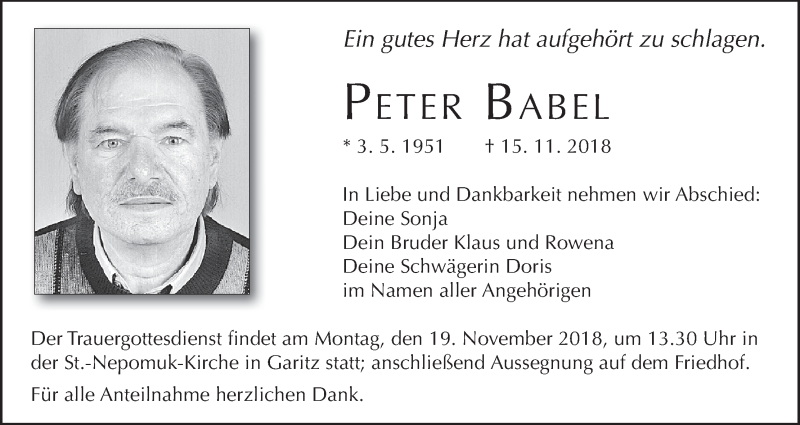 Hier finden Sie alle Traueranzeigen aus der Zeitung, die bisher für Peter Babel erschienen sind. Weitere Traueranzeigen, die in der Zeitung erscheinen, werden hier ebenfalls aufgelistet
