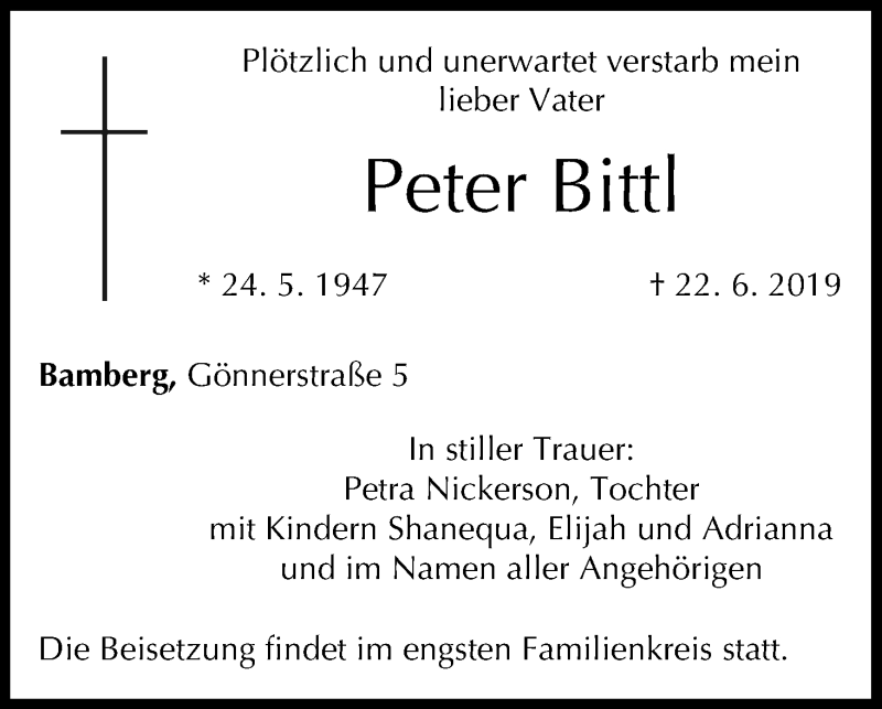 Hier finden Sie alle Traueranzeigen aus der Zeitung, die bisher für Peter Bittl erschienen sind. Weitere Traueranzeigen, die in der Zeitung erscheinen, werden hier ebenfalls aufgelistet