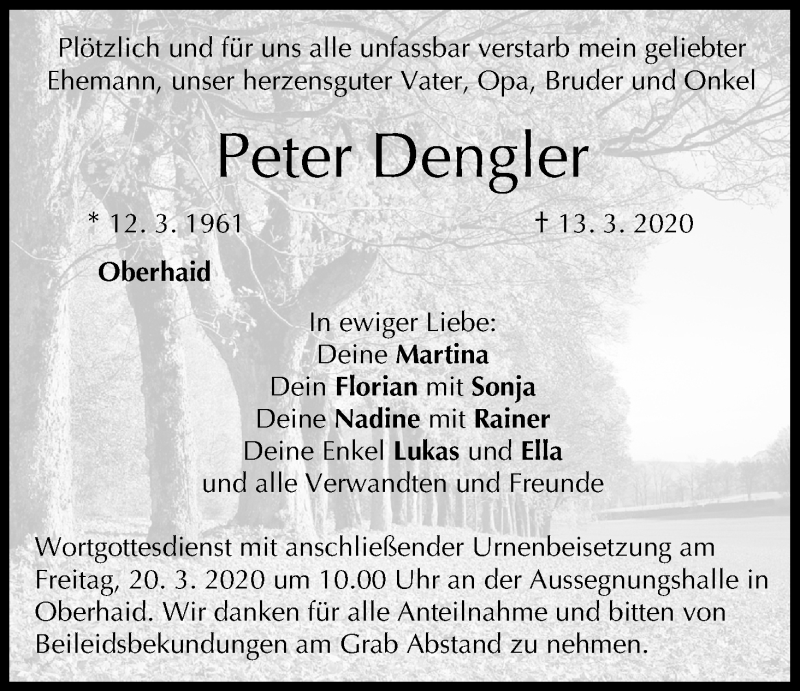 Hier finden Sie alle Traueranzeigen aus der Zeitung, die bisher für Peter Dengler erschienen sind. Weitere Traueranzeigen, die in der Zeitung erscheinen, werden hier ebenfalls aufgelistet