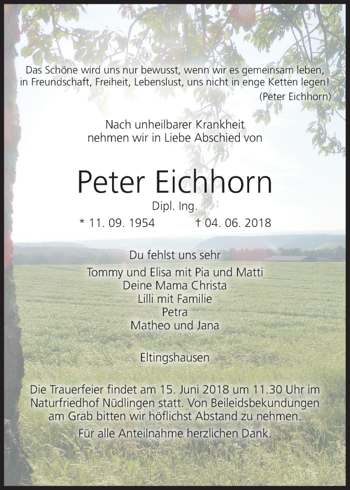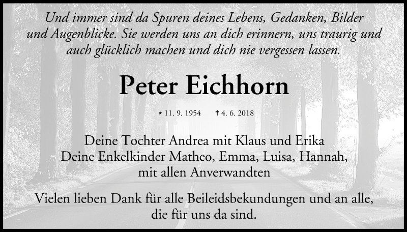 Hier finden Sie alle Traueranzeigen aus der Zeitung, die bisher für Peter Eichhorn erschienen sind. Weitere Traueranzeigen, die in der Zeitung erscheinen, werden hier ebenfalls aufgelistet