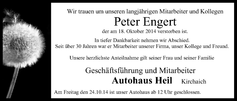 Hier finden Sie alle Traueranzeigen aus der Zeitung, die bisher für Peter Engert erschienen sind. Weitere Traueranzeigen, die in der Zeitung erscheinen, werden hier ebenfalls aufgelistet