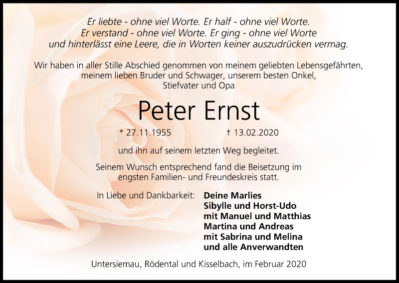 Hier finden Sie alle Traueranzeigen aus der Zeitung, die bisher für Peter Ernst erschienen sind. Weitere Traueranzeigen, die in der Zeitung erscheinen, werden hier ebenfalls aufgelistet