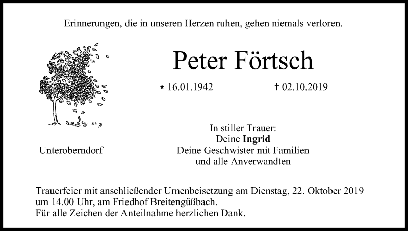 Hier finden Sie alle Traueranzeigen aus der Zeitung, die bisher für Peter Förtsch erschienen sind. Weitere Traueranzeigen, die in der Zeitung erscheinen, werden hier ebenfalls aufgelistet