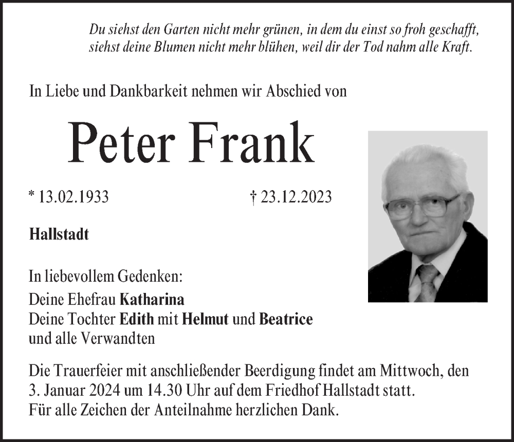 Hier finden Sie alle Traueranzeigen aus der Zeitung, die bisher für Peter Frank erschienen sind. Weitere Traueranzeigen, die in der Zeitung erscheinen, werden hier ebenfalls aufgelistet