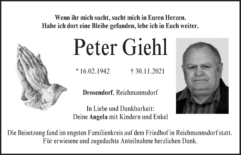 Hier finden Sie alle Traueranzeigen aus der Zeitung, die bisher für Peter Giehl erschienen sind. Weitere Traueranzeigen, die in der Zeitung erscheinen, werden hier ebenfalls aufgelistet