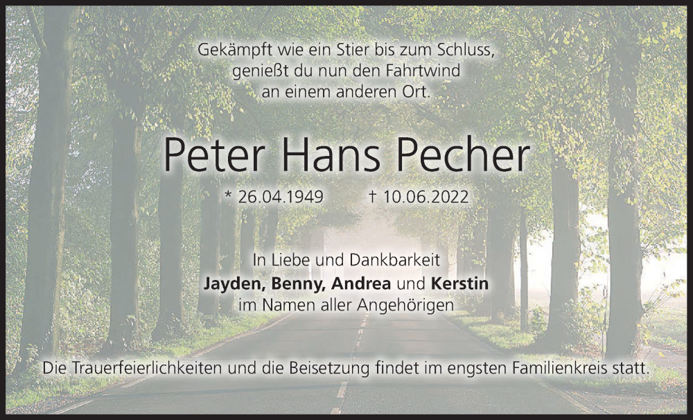 Hier finden Sie alle Traueranzeigen aus der Zeitung, die bisher für Peter Hans Pecher erschienen sind. Weitere Traueranzeigen, die in der Zeitung erscheinen, werden hier ebenfalls aufgelistet