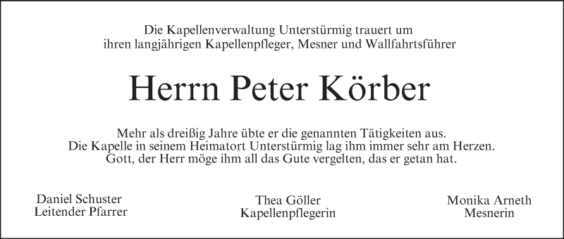 Hier finden Sie alle Traueranzeigen aus der Zeitung, die bisher für Peter Körber erschienen sind. Weitere Traueranzeigen, die in der Zeitung erscheinen, werden hier ebenfalls aufgelistet