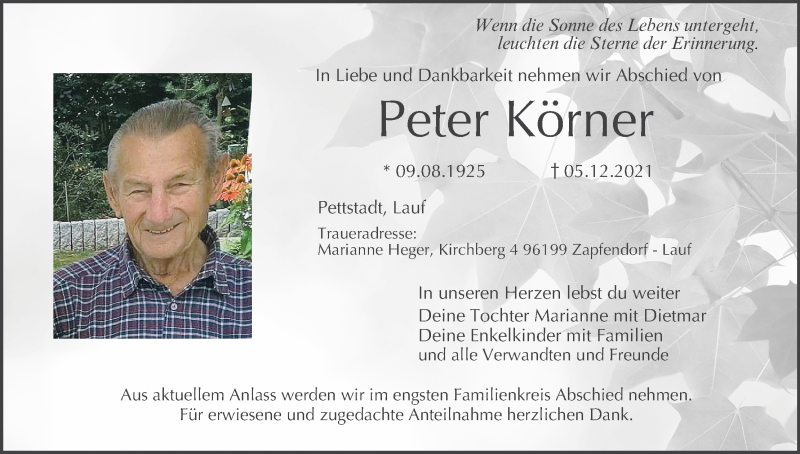 Hier finden Sie alle Traueranzeigen aus der Zeitung, die bisher für Peter Körner erschienen sind. Weitere Traueranzeigen, die in der Zeitung erscheinen, werden hier ebenfalls aufgelistet