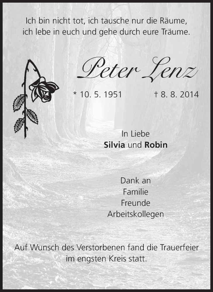 Hier finden Sie alle Traueranzeigen aus der Zeitung, die bisher für Peter Lenz erschienen sind. Weitere Traueranzeigen, die in der Zeitung erscheinen, werden hier ebenfalls aufgelistet