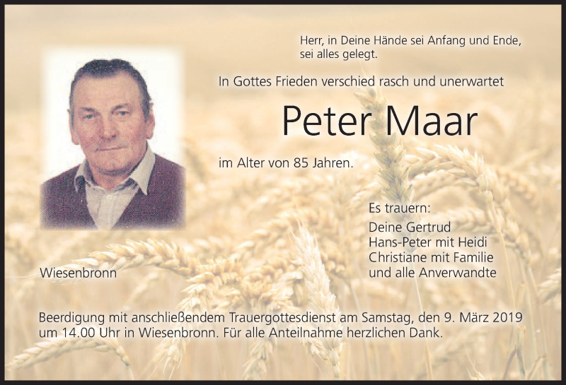 Hier finden Sie alle Traueranzeigen aus der Zeitung, die bisher für Peter Maar erschienen sind. Weitere Traueranzeigen, die in der Zeitung erscheinen, werden hier ebenfalls aufgelistet