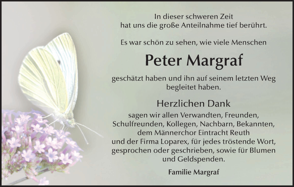 Hier finden Sie alle Traueranzeigen aus der Zeitung, die bisher für Peter Margraf erschienen sind. Weitere Traueranzeigen, die in der Zeitung erscheinen, werden hier ebenfalls aufgelistet