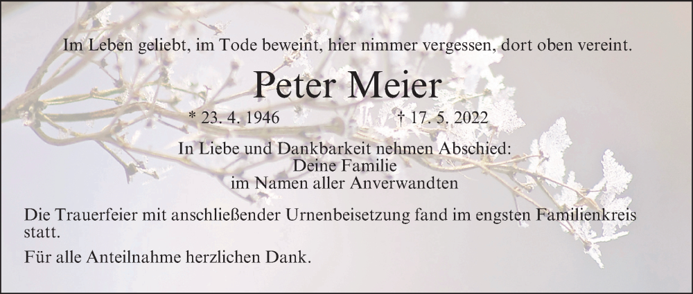 Hier finden Sie alle Traueranzeigen aus der Zeitung, die bisher für Peter Meier erschienen sind. Weitere Traueranzeigen, die in der Zeitung erscheinen, werden hier ebenfalls aufgelistet
