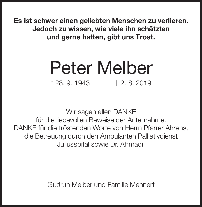 Hier finden Sie alle Traueranzeigen aus der Zeitung, die bisher für Peter Melber erschienen sind. Weitere Traueranzeigen, die in der Zeitung erscheinen, werden hier ebenfalls aufgelistet
