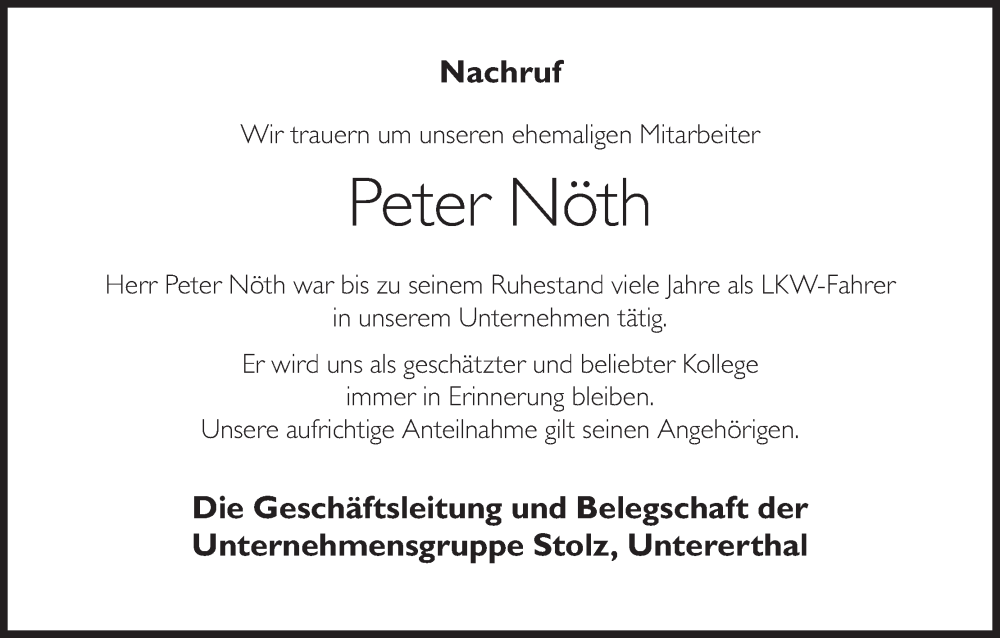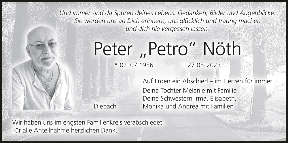 Hier finden Sie alle Traueranzeigen aus der Zeitung, die bisher für Peter Nöth erschienen sind. Weitere Traueranzeigen, die in der Zeitung erscheinen, werden hier ebenfalls aufgelistet