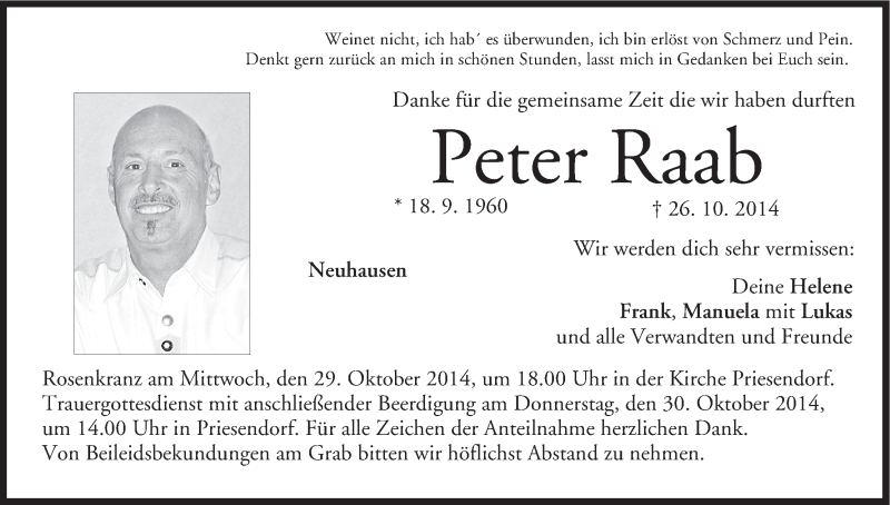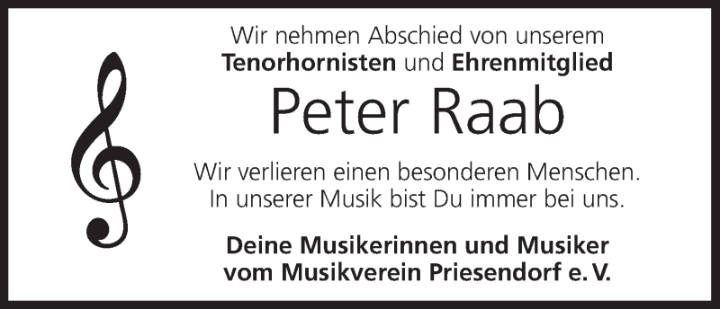 Hier finden Sie alle Traueranzeigen aus der Zeitung, die bisher für Peter Raab erschienen sind. Weitere Traueranzeigen, die in der Zeitung erscheinen, werden hier ebenfalls aufgelistet