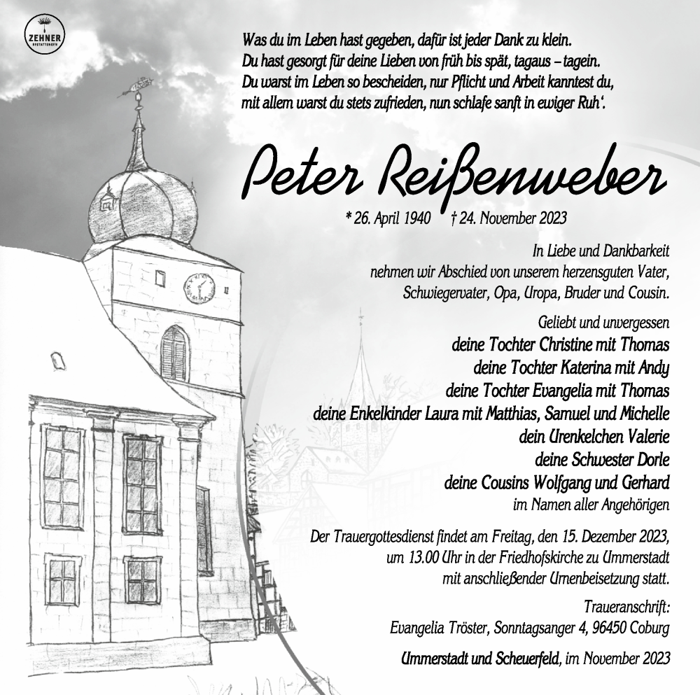 Hier finden Sie alle Traueranzeigen aus der Zeitung, die bisher für Peter Reißenweber erschienen sind. Weitere Traueranzeigen, die in der Zeitung erscheinen, werden hier ebenfalls aufgelistet