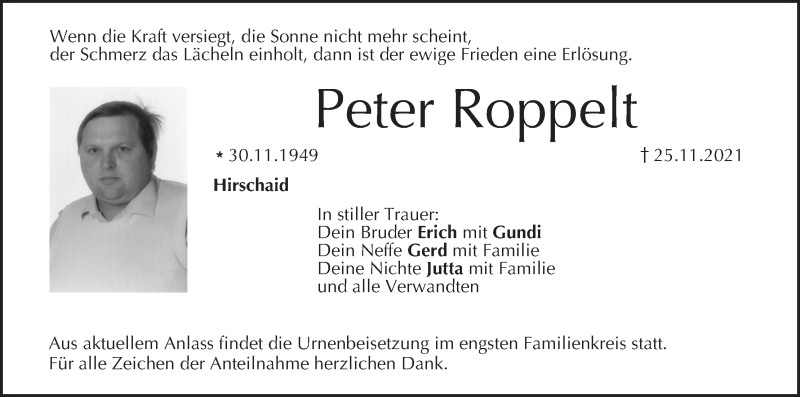 Hier finden Sie alle Traueranzeigen aus der Zeitung, die bisher für Peter Roppelt erschienen sind. Weitere Traueranzeigen, die in der Zeitung erscheinen, werden hier ebenfalls aufgelistet