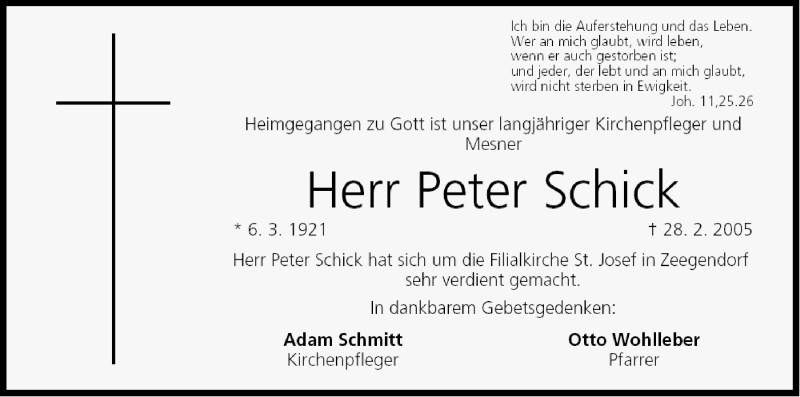 Hier finden Sie alle Traueranzeigen aus der Zeitung, die bisher für Peter Schick erschienen sind. Weitere Traueranzeigen, die in der Zeitung erscheinen, werden hier ebenfalls aufgelistet