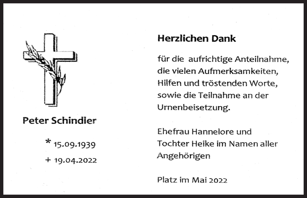 Hier finden Sie alle Traueranzeigen aus der Zeitung, die bisher für Peter Schindler erschienen sind. Weitere Traueranzeigen, die in der Zeitung erscheinen, werden hier ebenfalls aufgelistet