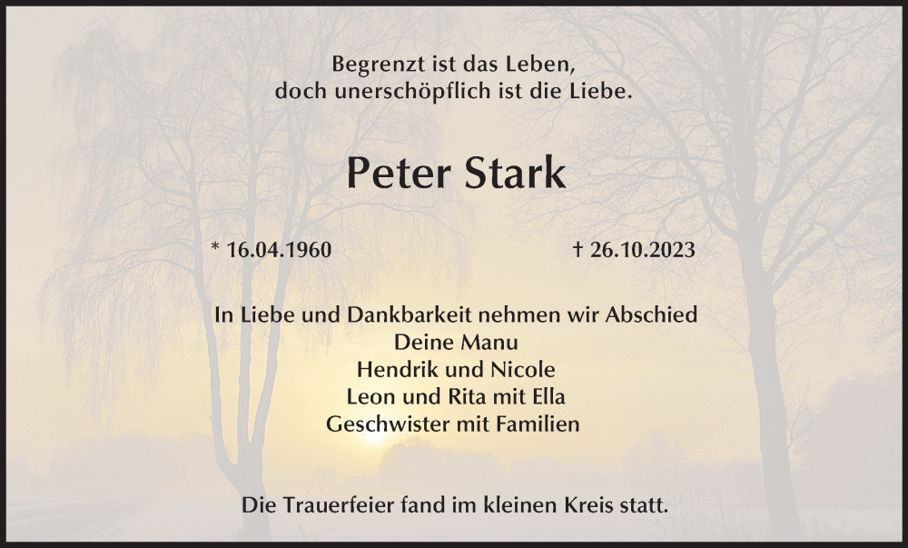 Hier finden Sie alle Traueranzeigen aus der Zeitung, die bisher für Peter Stark erschienen sind. Weitere Traueranzeigen, die in der Zeitung erscheinen, werden hier ebenfalls aufgelistet