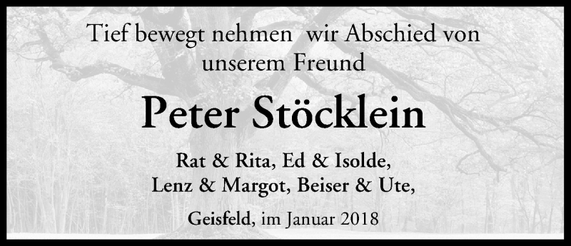 Hier finden Sie alle Traueranzeigen aus der Zeitung, die bisher für Peter Stöcklein erschienen sind. Weitere Traueranzeigen, die in der Zeitung erscheinen, werden hier ebenfalls aufgelistet