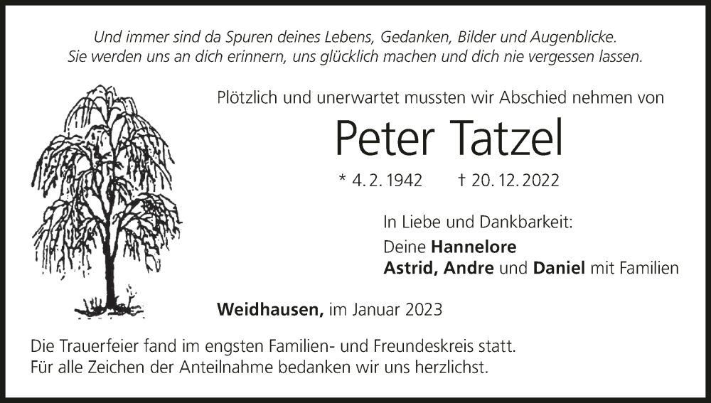 Hier finden Sie alle Traueranzeigen aus der Zeitung, die bisher für Peter Tatzel erschienen sind. Weitere Traueranzeigen, die in der Zeitung erscheinen, werden hier ebenfalls aufgelistet