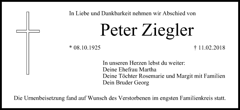 Hier finden Sie alle Traueranzeigen aus der Zeitung, die bisher für Peter Ziegler erschienen sind. Weitere Traueranzeigen, die in der Zeitung erscheinen, werden hier ebenfalls aufgelistet