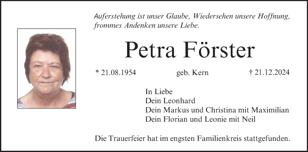 Hier finden Sie alle Traueranzeigen aus der Zeitung, die bisher für Petra Förster erschienen sind. Weitere Traueranzeigen, die in der Zeitung erscheinen, werden hier ebenfalls aufgelistet