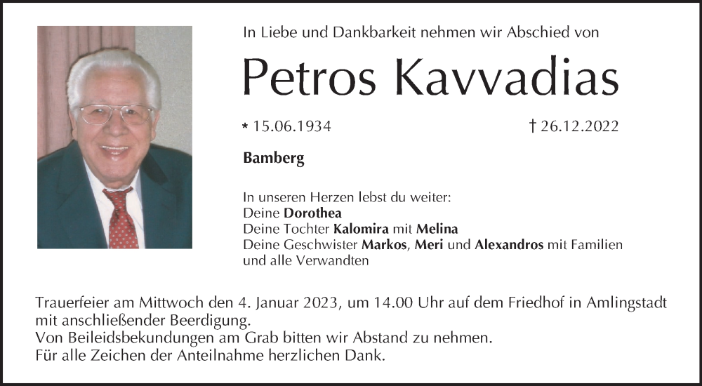 Hier finden Sie alle Traueranzeigen aus der Zeitung, die bisher für Petros Kavvadias erschienen sind. Weitere Traueranzeigen, die in der Zeitung erscheinen, werden hier ebenfalls aufgelistet