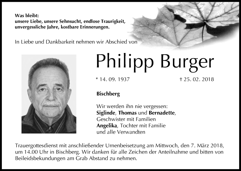 Hier finden Sie alle Traueranzeigen aus der Zeitung, die bisher für Philipp Burger erschienen sind. Weitere Traueranzeigen, die in der Zeitung erscheinen, werden hier ebenfalls aufgelistet