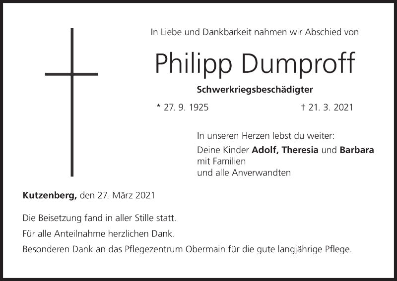 Hier finden Sie alle Traueranzeigen aus der Zeitung, die bisher für Philipp Dumproff erschienen sind. Weitere Traueranzeigen, die in der Zeitung erscheinen, werden hier ebenfalls aufgelistet