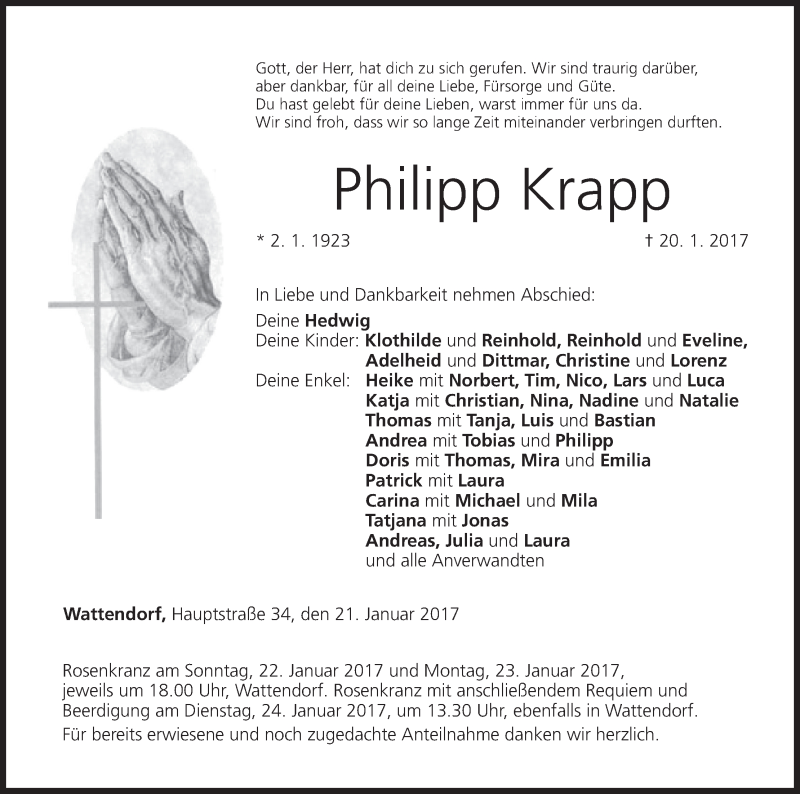 Hier finden Sie alle Traueranzeigen aus der Zeitung, die bisher für Philipp Krapp erschienen sind. Weitere Traueranzeigen, die in der Zeitung erscheinen, werden hier ebenfalls aufgelistet