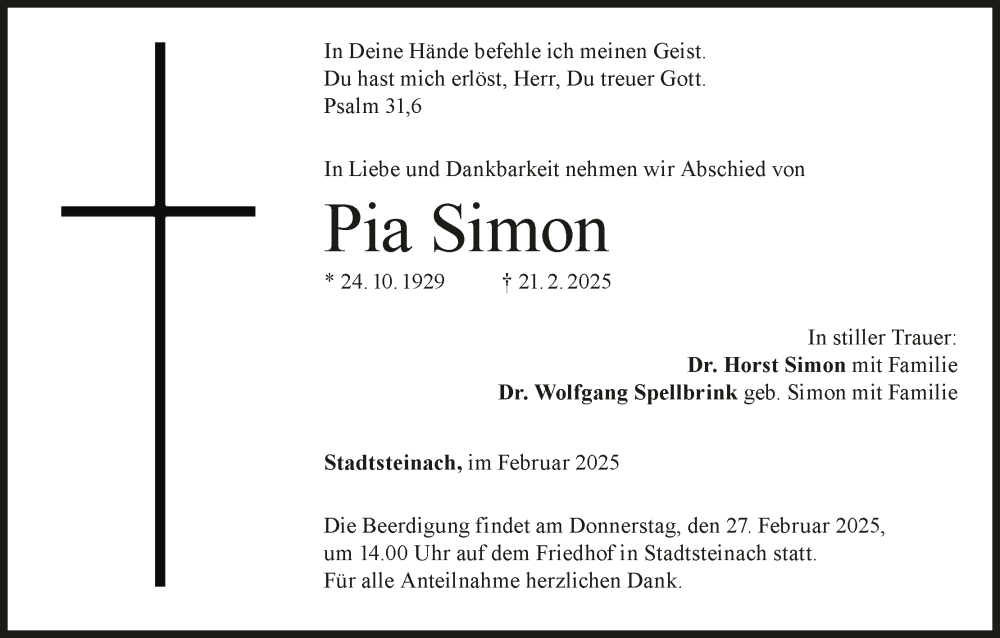Hier finden Sie alle Traueranzeigen aus der Zeitung, die bisher für Pia Simon erschienen sind. Weitere Traueranzeigen, die in der Zeitung erscheinen, werden hier ebenfalls aufgelistet