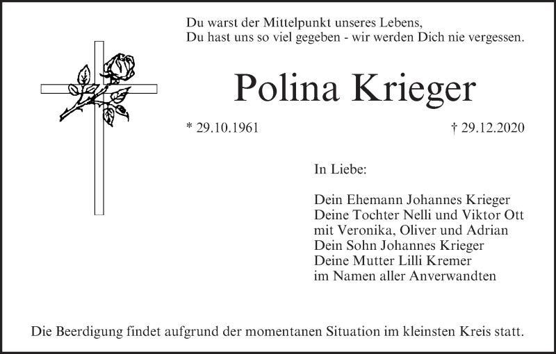 Hier finden Sie alle Traueranzeigen aus der Zeitung, die bisher für Polina Krieger erschienen sind. Weitere Traueranzeigen, die in der Zeitung erscheinen, werden hier ebenfalls aufgelistet