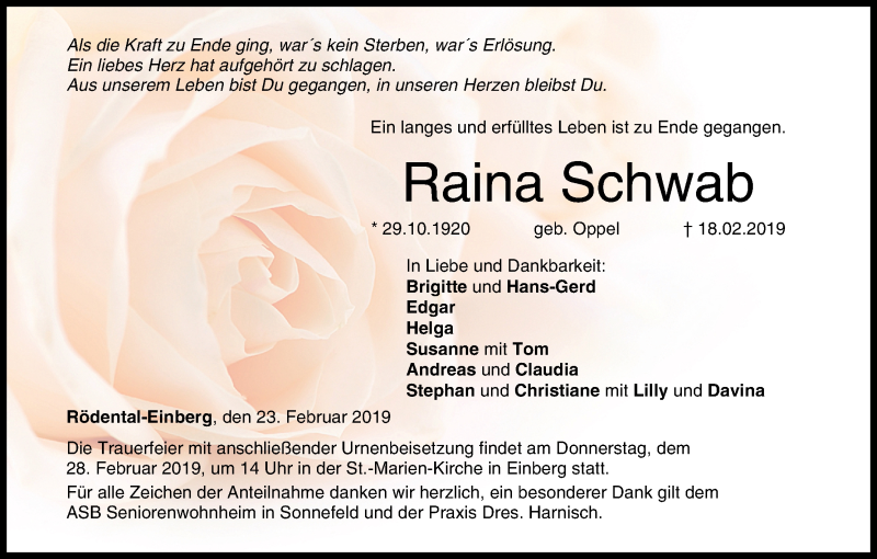 Hier finden Sie alle Traueranzeigen aus der Zeitung, die bisher für Raina Schwab erschienen sind. Weitere Traueranzeigen, die in der Zeitung erscheinen, werden hier ebenfalls aufgelistet