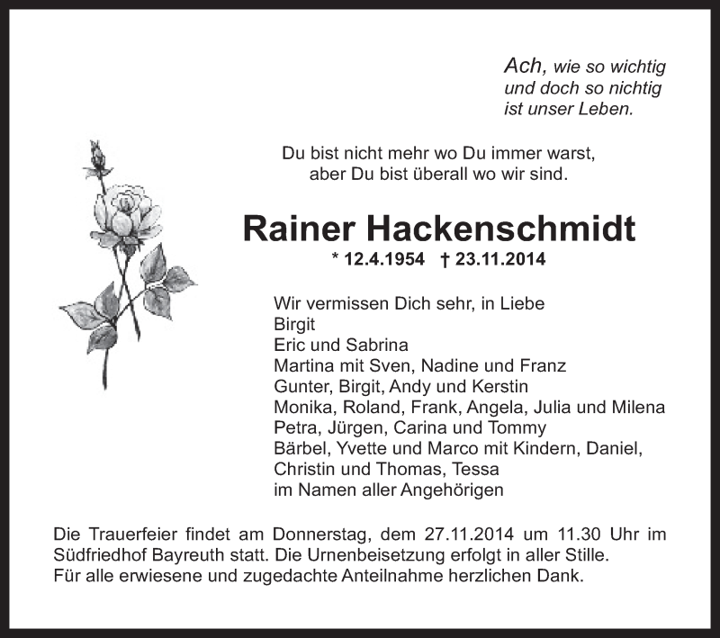Hier finden Sie alle Traueranzeigen aus der Zeitung, die bisher für Rainer Hackenschmidt erschienen sind. Weitere Traueranzeigen, die in der Zeitung erscheinen, werden hier ebenfalls aufgelistet