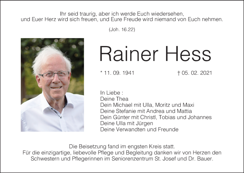 Hier finden Sie alle Traueranzeigen aus der Zeitung, die bisher für Rainer Hess erschienen sind. Weitere Traueranzeigen, die in der Zeitung erscheinen, werden hier ebenfalls aufgelistet