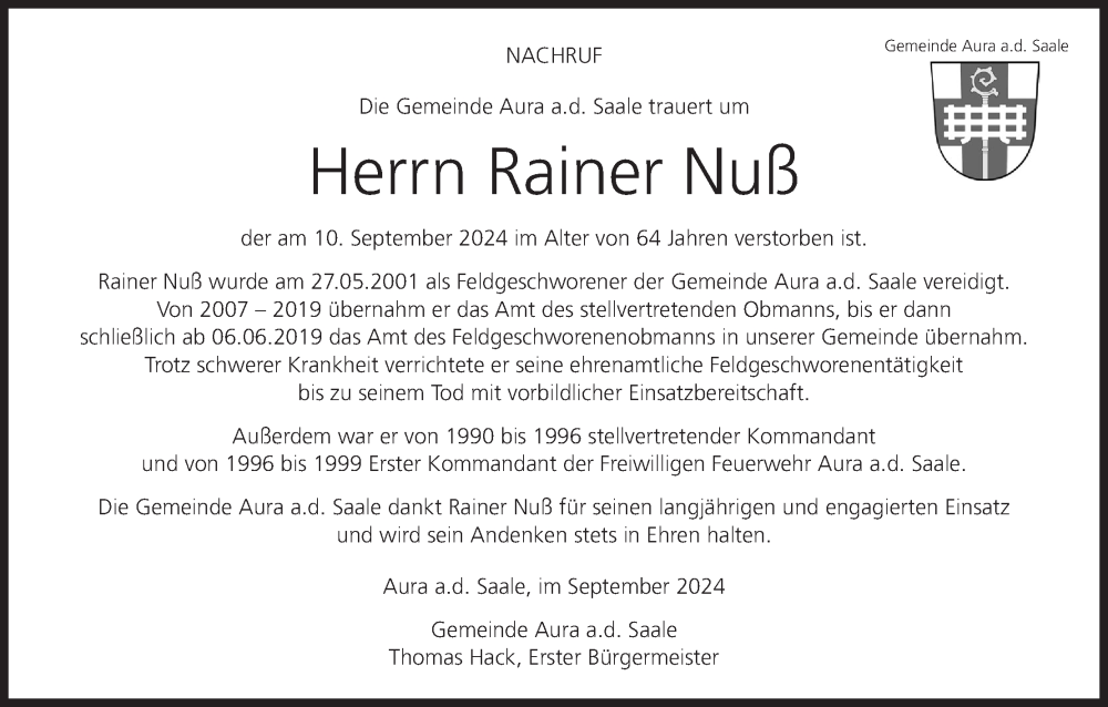 Hier finden Sie alle Traueranzeigen aus der Zeitung, die bisher für Rainer Nuß erschienen sind. Weitere Traueranzeigen, die in der Zeitung erscheinen, werden hier ebenfalls aufgelistet