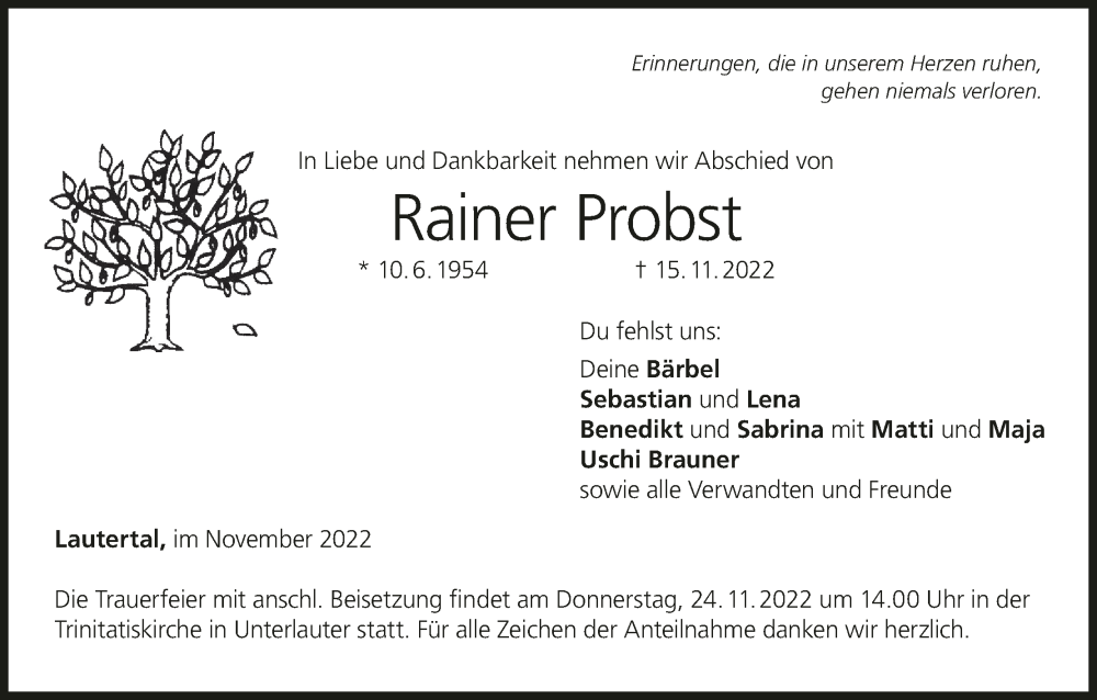 Hier finden Sie alle Traueranzeigen aus der Zeitung, die bisher für Rainer Probst erschienen sind. Weitere Traueranzeigen, die in der Zeitung erscheinen, werden hier ebenfalls aufgelistet