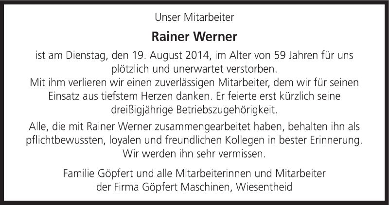 Hier finden Sie alle Traueranzeigen aus der Zeitung, die bisher für Rainer Werner erschienen sind. Weitere Traueranzeigen, die in der Zeitung erscheinen, werden hier ebenfalls aufgelistet