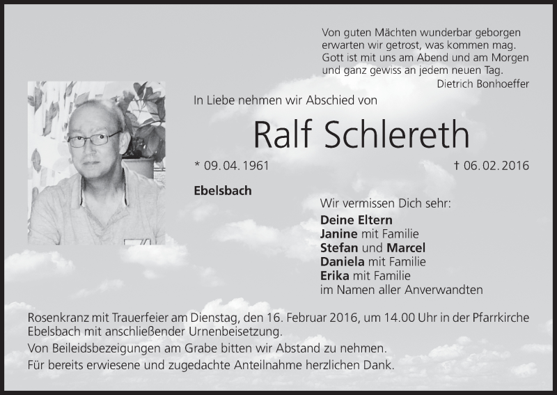 Hier finden Sie alle Traueranzeigen aus der Zeitung, die bisher für Ralf Schlereth erschienen sind. Weitere Traueranzeigen, die in der Zeitung erscheinen, werden hier ebenfalls aufgelistet
