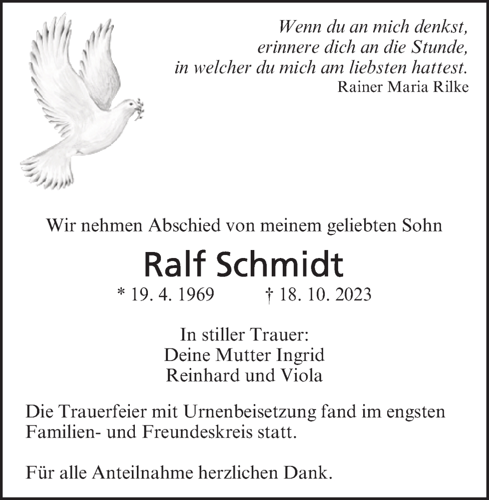 Hier finden Sie alle Traueranzeigen aus der Zeitung, die bisher für Ralf Schmidt erschienen sind. Weitere Traueranzeigen, die in der Zeitung erscheinen, werden hier ebenfalls aufgelistet