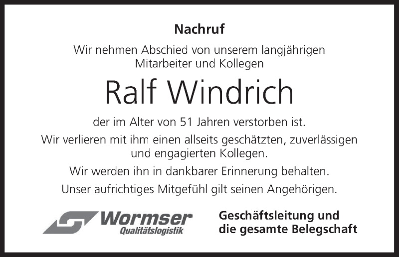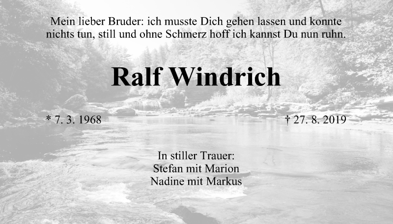 Hier finden Sie alle Traueranzeigen aus der Zeitung, die bisher für Ralf Windrich erschienen sind. Weitere Traueranzeigen, die in der Zeitung erscheinen, werden hier ebenfalls aufgelistet
