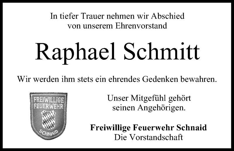 Hier finden Sie alle Traueranzeigen aus der Zeitung, die bisher für Raphael Schmitt erschienen sind. Weitere Traueranzeigen, die in der Zeitung erscheinen, werden hier ebenfalls aufgelistet