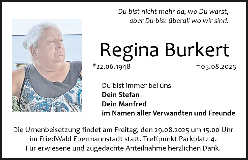 Hier finden Sie alle Traueranzeigen aus der Zeitung, die bisher für Regina Burkert erschienen sind. Weitere Traueranzeigen, die in der Zeitung erscheinen, werden hier ebenfalls aufgelistet