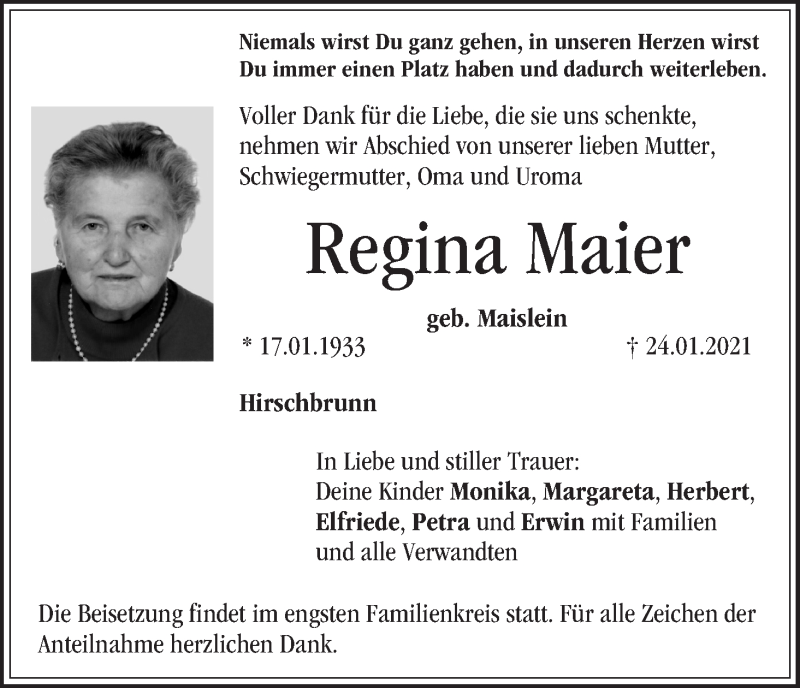 Hier finden Sie alle Traueranzeigen aus der Zeitung, die bisher für Regina Maier erschienen sind. Weitere Traueranzeigen, die in der Zeitung erscheinen, werden hier ebenfalls aufgelistet