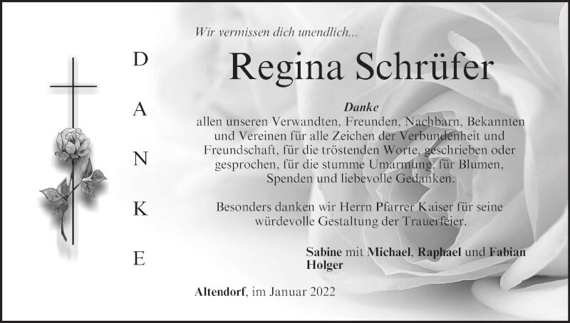 Hier finden Sie alle Traueranzeigen aus der Zeitung, die bisher für Regina Schrüfer erschienen sind. Weitere Traueranzeigen, die in der Zeitung erscheinen, werden hier ebenfalls aufgelistet